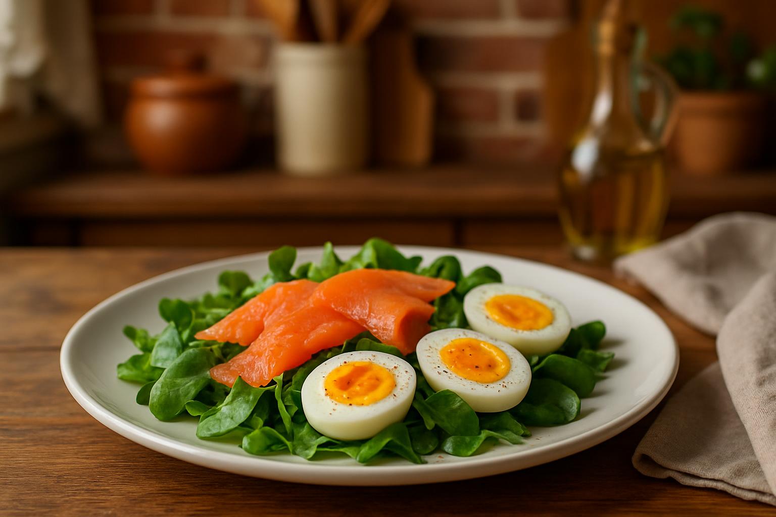 Składniki: 2 jajka, 50 g łososia wędzonego, 50 g sałaty zielonej, rukoli, roszponki (lub miksu sałat), 1 łyęczka oliwy z oliwek (5 ml), sól, pieprz, odrobina soku z cytryny.