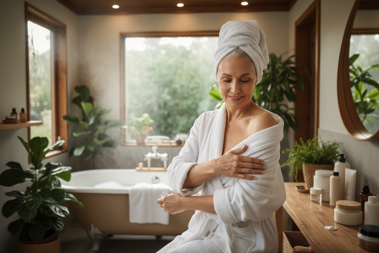 Balsam do ciała po każdej kąpieli lub prysznicu to absolutna podstawa dla kobiet po menopauzie. Skóra ciała po hormonalnych zmianach traci wilgoć szybciej niż kiedykolwiek, a bez regularnego nawilżania szybko staje się przesuszona, swędząca i podatna na podrażnienia.